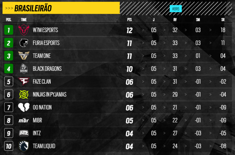 Já pelo outro lado da tabela, a Liquid amarga o último lugar com apenas quatro pontos após cinco jogos. A INTZ é mais um time que conquistou somente uma vitória até o momento, mas aparece na frente da cavalaria por conta do saldo de rodadas.