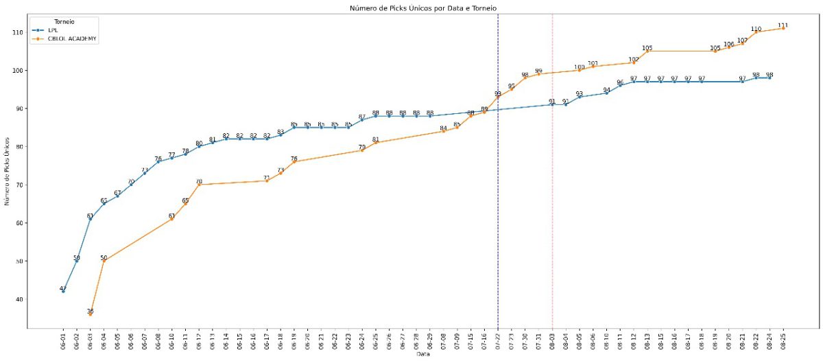 Nosso ponto de partida da análise é de que o CBLOL Academy antes da implementação do Fearless Draft havia selecionado 89 campeões, enquanto a LPL 88 campeões (já em formato Fearless).