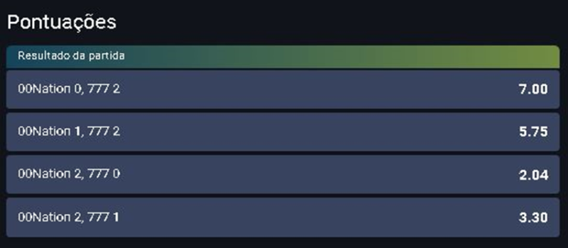 Esse primeiro bloco trata de uma soma de mapas vencidos ou perdidos por cada equipe. Por exemplo: caso faça uma aposta no handicap negativo -1.5 da 00Nation, você estará “beneficiando” a 777 com um mapa e meio, então para a sua aposta sair vencedora, precisará que a 00Nation vença o confronto por dois mapas a zero. Se sua equipe perder um mapa na série, teoricamente o adversário chegará a dois mapas e meio, e a aposta será perdedora. Isso acontece porque o máximo que sua equipe conseguirá ganhar são dois mapas, enquanto o adversário já conquistou dois e meio.