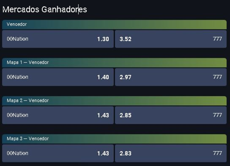 Atente-se que numa série “Melhor de 3”, como no exemplo acima, o mercado ganhador simples compreende a série completa, ou seja, os possíveis três mapas. Porém, nesse mercado também existe a possibilidade de se apostar no vencedor de um mapa isolado, como no exemplo a seguir: