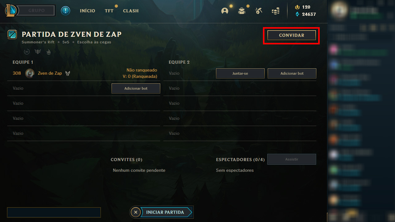 Passo 5: Clique em confirmar. Já com a sala criada você pode convidar os amigos pelo botão “Convidar” ou clicando com o botão direito no mouse no amigo em questão e selecionando “Convidar para partida”. Também é possível mover os jogadores de equipe ou até mesmo adicionar bots.