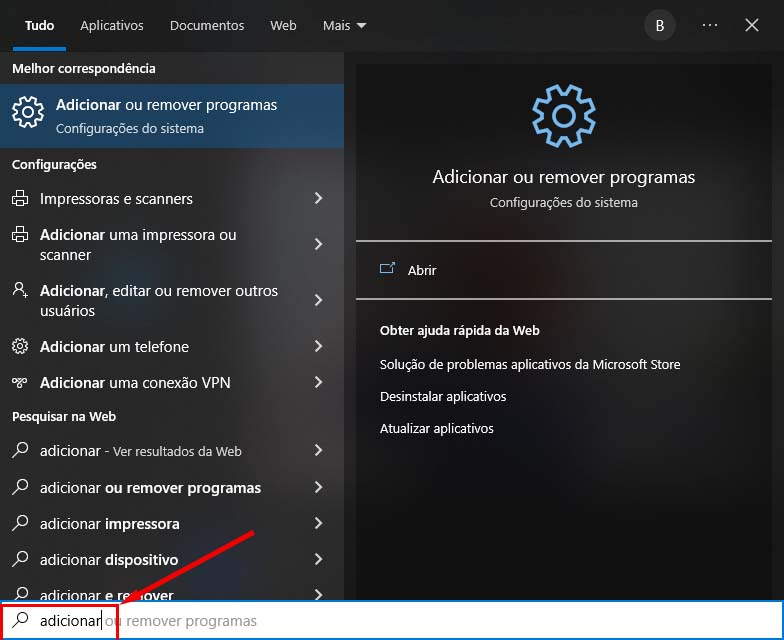 Passo 1: Para desinstalar o LoL do PC, digite “Adicionar ou remover programas” na barra de buscas;