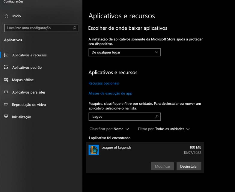 Passo 2: Na tela de remoção de aplicativos, basta digitar “League of Legends”