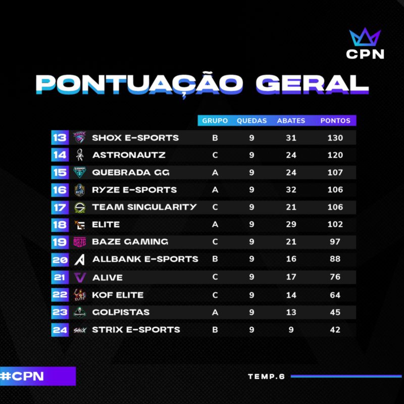 A primeira semana da sexta temporada da Copa Nobru terminou com os Crias na primeira colocação. O último dia de jogo foi nesta quinta-feira (11) e definiu os primeiros 18 times classificados para a semifinal.
