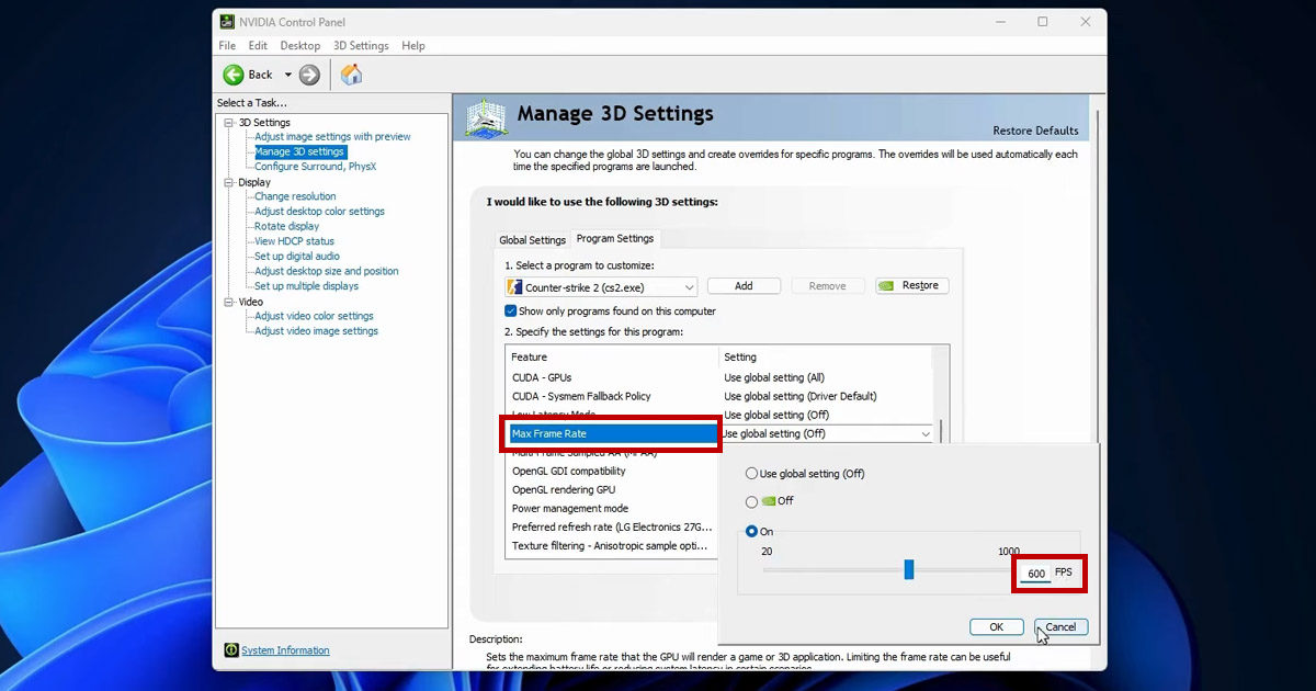 Trave o FPS no Nvidia Control Panel (ou ferramenta similar) em um valor médio acima da taxa de atualização do seu monitor (por exemplo, 600 FPS, como demonstrado no vídeo)
