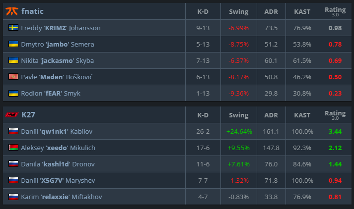 Mesmo com o atropelo na Mirage, a K27 não conseguiu manter o ritmo. A fnatic venceu a série melhor de três por 2 a 1 e avançou pela chave superior do classificatório.