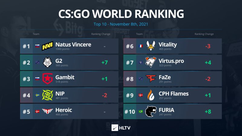 A FURIA estava em 18° na última atualização, realizada há uma semana. Agora, a equipe completa o top 10 da HLTV. Veja os 10 times mais bem colocados no ranking.