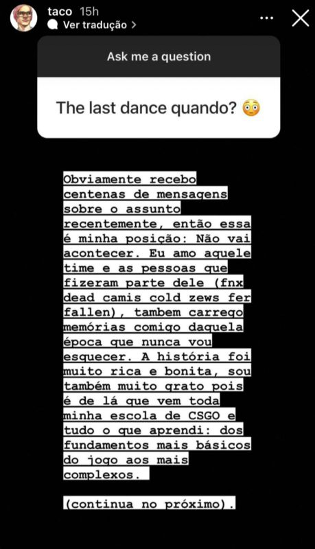 TACO se pronunciou sobre o “Last Dance” ao responder os questionamentos dos fãs no Instagram. O jogador da GODSENT disse que ama aquele time e as pessoas que fizeram parte dele, porém “não vai acontecer”.