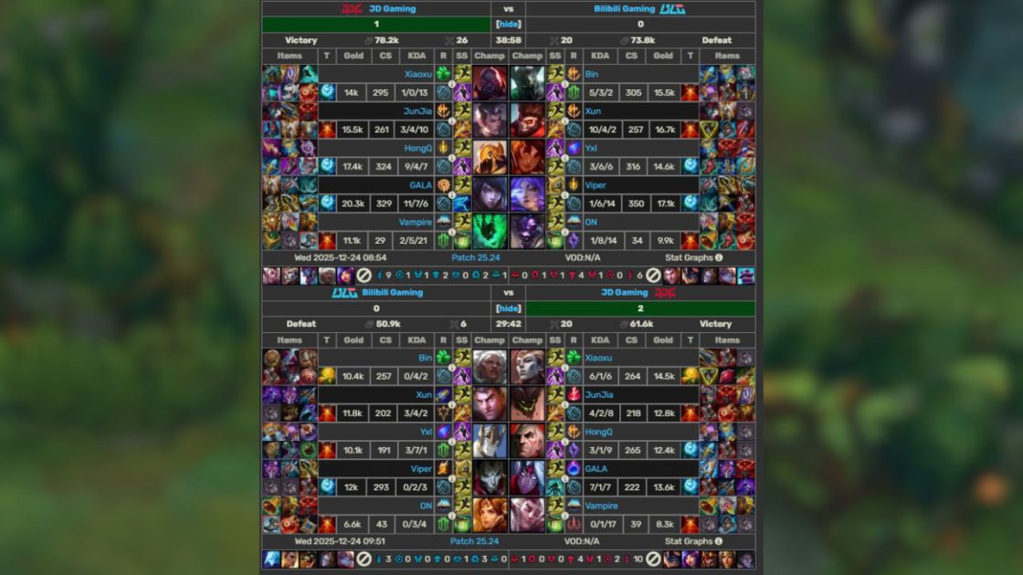 Vivendo o 1×1, o próximo desafio foi a JDG, que também não estava em uma situação tão clara no grupo. Contudo, com um atropelo do GALA e do HongQ no jogo 1 e, no segundo, com direito a Swain do HongQ, a BLG sofreu mais um 2×0 e acabou eliminada.