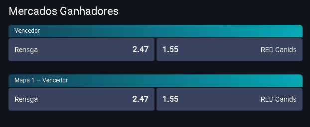 No exemplo, Red Canids aparece com uma odd de 1.55 para vencer o confronto, enquanto a Rensga tem 2.47. Isso significa que a Red é a favorita na partida, pois, quanto menor a odd, maior a probabilidade da equipe sair vencedora. Com isso, caso aposte na Matilha e a superioridade se confirme, terá sua aposta vencedora.