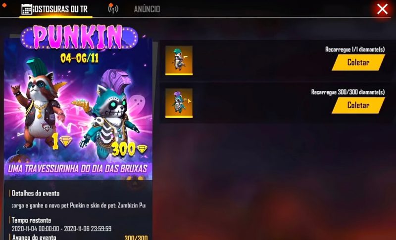 Com o Free Fire aberto na tela de eventos, basta “recarregar” o jogo comprando o pacote de diamantes mais barato, que contém 100 diamantes por 4,49 reais. Porém se o jogador também quiser a skin Zumbzin Punkin, ele terá que comprar o pacote com 300 diamantes, que sai por 13,99 reais.