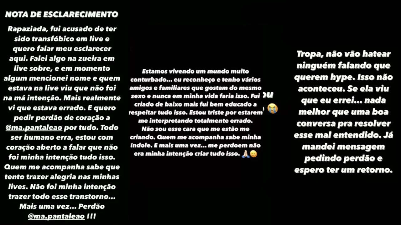 Já El Racha ressaltou que errou e não tem justificativa para o que fez. Ele pediu desculpas a influenciadora e aos seus espectadores, ressaltando que isso servirá de “aprendizado para todos”.