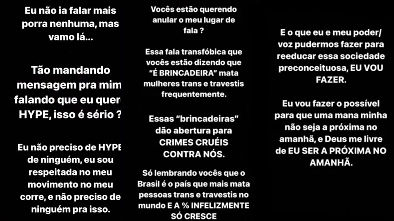 É por isso que eu não faço amizade, prefiro ser sozinha, porque é esse tipo de coisa que acontece quando tendo fazer amizade com alguém […]. Todo dia é uma nova coisa que coloca na minha cabeça assim ‘some, some da internet que você vai acabar morrendo um dia de tanto ler esse tipo de coisa.