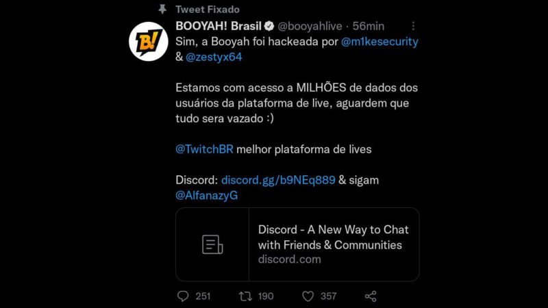 Mais tarde, os invasores publicaram ter em mãos “milhões de dados dos usuários da plataforma”, e ainda ameaçaram o vazamento de todos eles. Na postagem, ainda chegaram a citar a Twitch, plataforma rival da BOOYAH, como a “melhor plataforma de lives”.