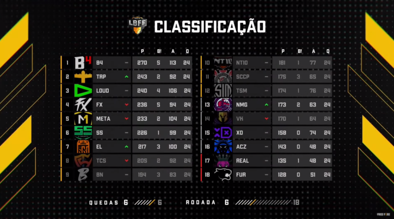 Confira como ficou a classificação da LBFF 6 após as quedas de hoje: