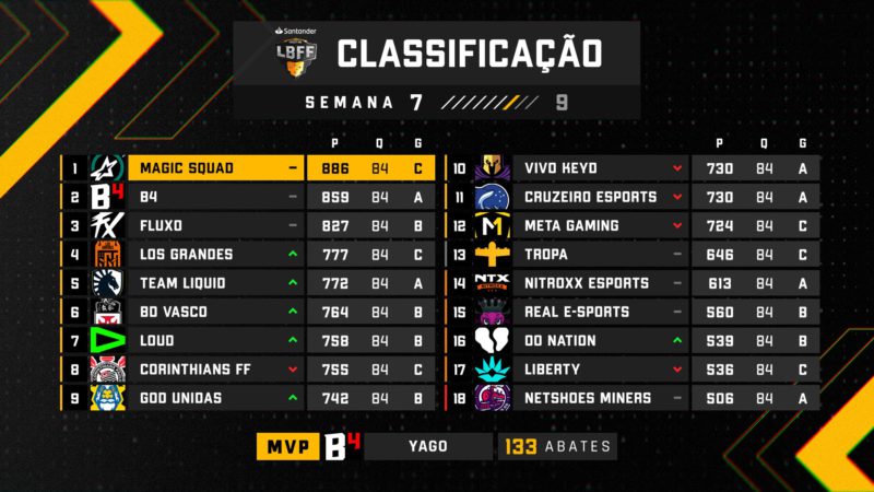 A sétima semana de jogos da LBFF 7 chegou ao fim. Após três dias de disputa, a Magic Squad segue firme na liderança da competição com 886 pontos e 396 eliminações. A B4, detentora de 859 pontos, e o Fluxo, que conta com 827, completam o pódio.