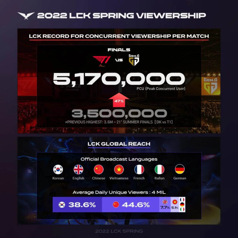 A LCK 2022 estabeleceu um novo recorde de audiência entre todas as edições da liga sul-coreana de League of Legends. Ao todo, mais de 5 milhões de espectadores acompanharam a final entre T1 e Gen.G, que resultou no décimo título de Faker.
