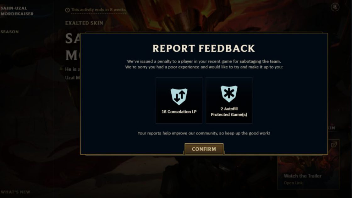 Antes de tudo: não é porque seu aliado feedou que você vai recuperar seus PDL automaticamente. A novidade é que, quando alguém, estando na sua equipe, feedar intencionalmente, não sair da base, pegar waves/campos da jungle na maldade… enfim, trollar e você reportar — e esse jogador for de fato punido — o feedback de report agora virá acompanhado de uma devolução de PDL.