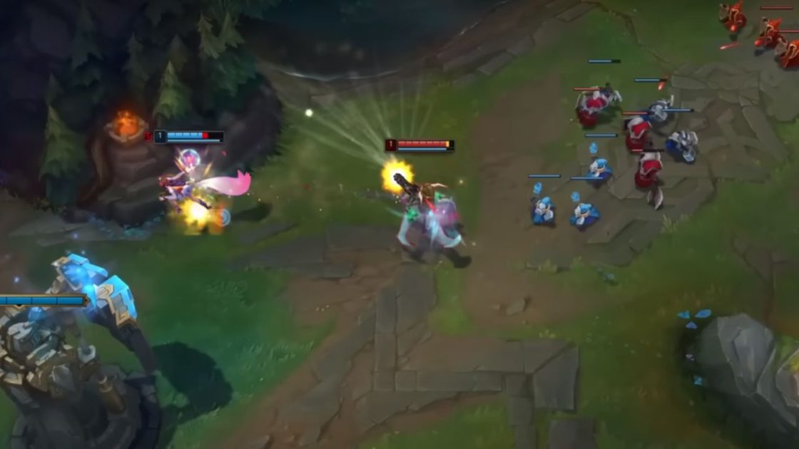 A jogabilidade é simples, no nível um, você quer começar com o E e passar pela wave e encher o oponente de auto-ataque. Perceba como o Scout ignora a onda de minions para trocar ataques na Ahri e a Chuva de Lâminas + E sempre vai lhe dar vantagem.