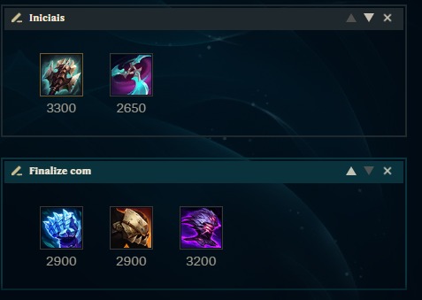 Seus grandes picos de poder são Hidra Titânica e Adaga de Navori, mas uma terceira boa opção é a Manopla dos Glacinatas, que ajuda a acertar o Q com mais facilidade. Depois desses três, você pode fechar qualquer item tank de acordo com a necessidade da partida.