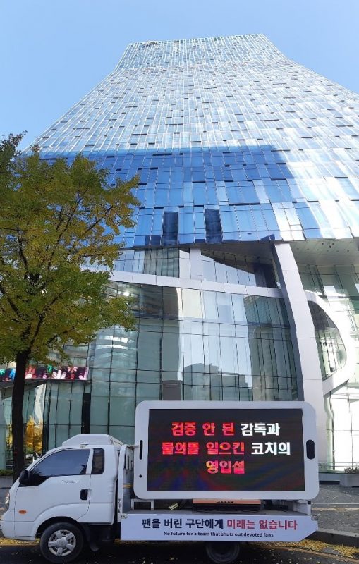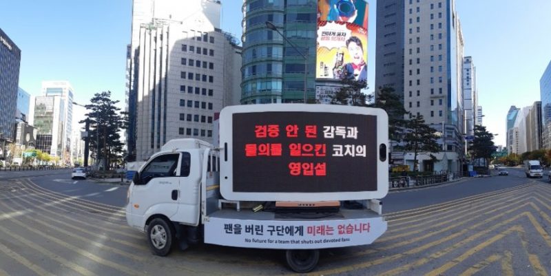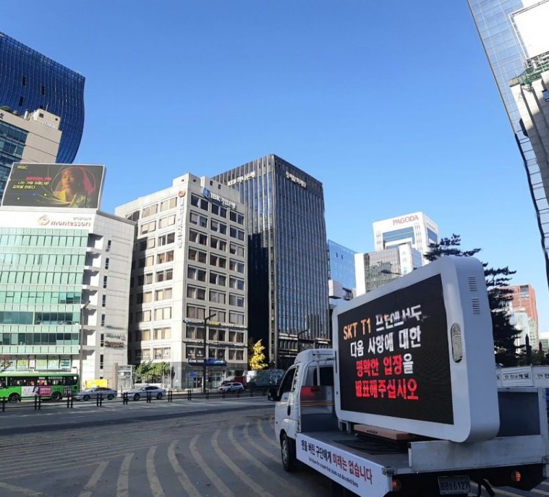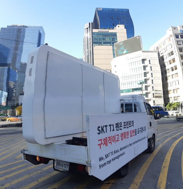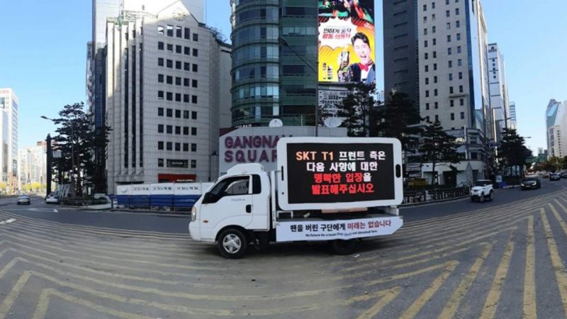Há alguns dias noticiamos a grande cobrança da torcida da T1 em cima da organização, com direito a flores de enterro sendo enviadas para a portaria do prédio da equipe. Os fãs sul-coreanos pretendem continuar com a pressão e agora enviaram uma caminhonete com letreiro para a porta do local.