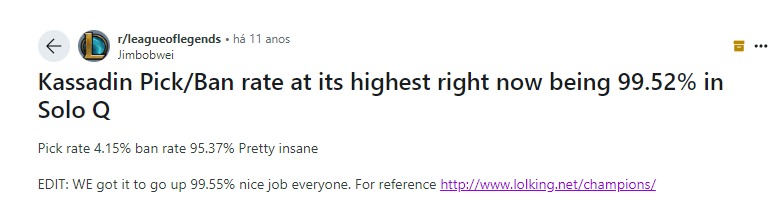 Foi aí que o Kassadin alcançou porcentagens de banimento que variavam entre 95-99%, levando a comunidade à loucura! Veja o print de um dos posts do Reddit na época: Veja o print da época:
