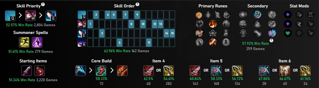 De acordo com dados do Lolalytics, essa nova build ainda não é a mais popular no elo Mestre+, mas já é a mais vitoriosa nesse recorte. Veja os números e a ordem dos itens mais eficientes.
