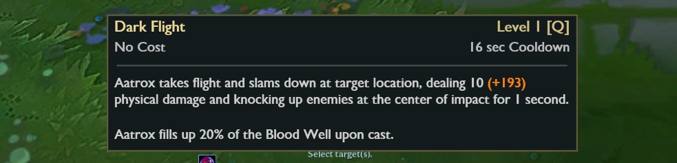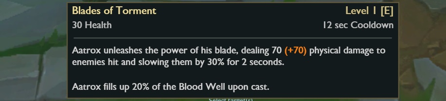 - Aatrox enche seu Poço de sangue através de suas habilidades. Quando Aatrox enche Poço de sangue em 100%, ele se torna “bloqueado” e começa a drenar durante 4s, garantindo a Aatrox “Blood Rush“ pela duração.