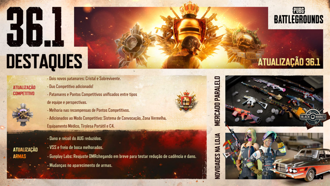 A Atualização 36.1 chegou ao PUBG: BATTLEGROUNDS com uma das maiores mudanças recentes no sistema competitivo, incluindo novos patamares, ajustes no RP e diversas novidades em armas e recompensas.