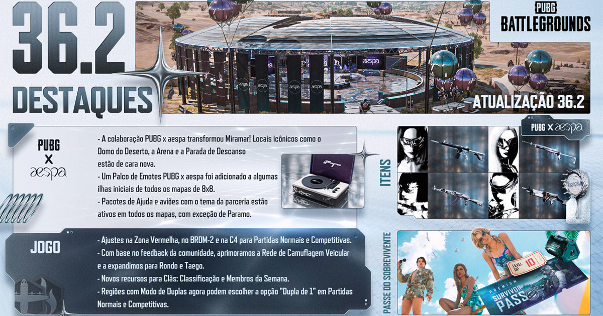 A Atualização 36.2 do PUBG já está disponível para PC e chega aos consoles no dia 16 de julho, trazendo uma enxurrada de novidades. Entre os destaques estão a colaboração com o grupo aespa, mudanças em mecânicas de gameplay, o aguardado UGC Alpha e uma reformulação no sistema de clãs.