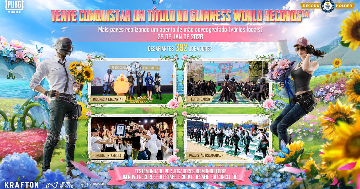 A quebra do recorde aconteceu no dia 25 de janeiro e contou com a participação de 392 jogadores de PUBG MOBILE espalhados pelo mundo. Os participantes se reuniram simultaneamente em quatro locais públicos icônicos, representando diferentes culturas e regiões.