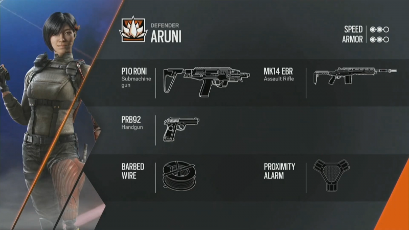 Foram detalhas todos os atributos da nova operadora, Aruni, da Tailândia. Ela tem dois de velocidade e dois de armadura. Em seu loadout, Aruni, de armamento primário, tem a opção da P10 Roni ou MK14 EBR. A única pistola disponível é a PRB92 e, por fim, seu gadget secundário poderá ser escolhido entre o Arame Farpado ou Alarme de Proximidade.