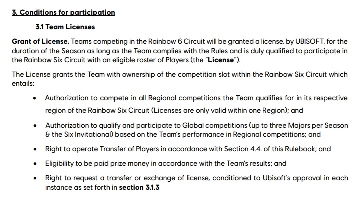 Segundo o regulamento da competição, a equipe precisa de uma licença para competir nos campeonatos da Ubisoft. O ponto 3.1 descrito como “Team Licenses” ou Licenças de Equipe, em tradução livre, fala que “a licença concede à equipe a propriedade da vaga da competição dentro do Circuito de Rainbow Six”.