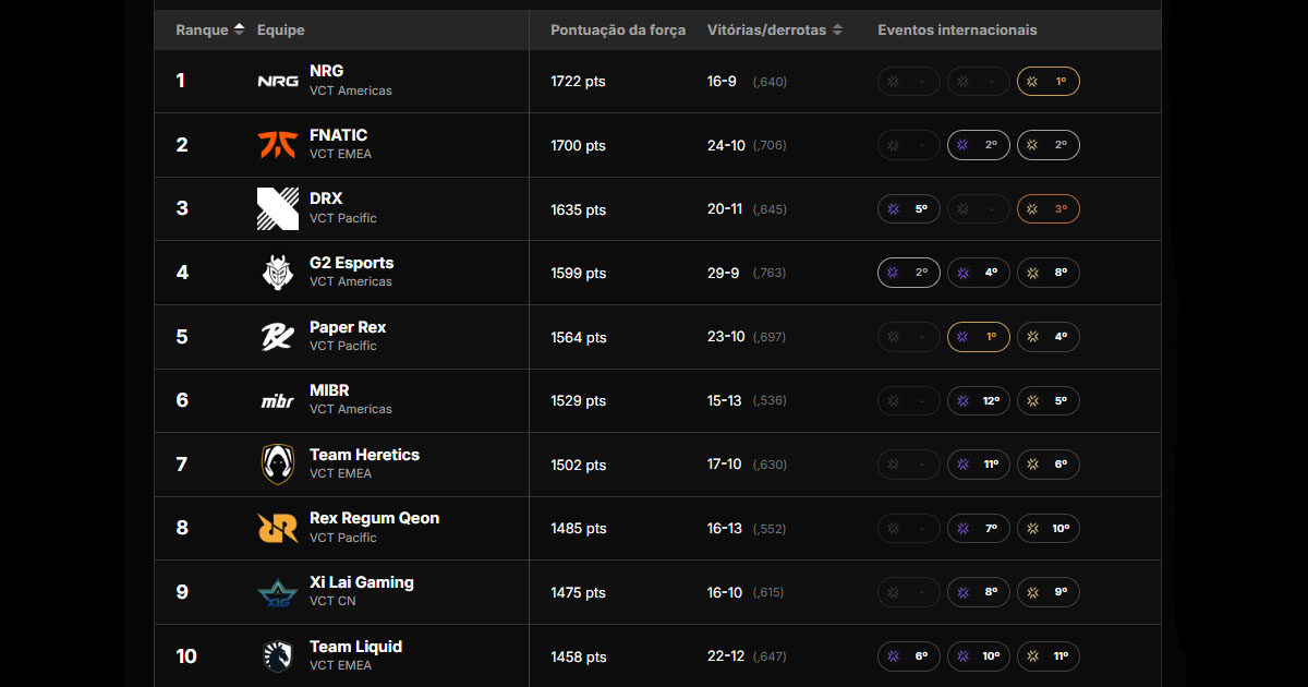 O ranking global teve como campeã a NRG Esports, dos Estados Unidos, seguida pela FNATIC (2º) e a sul-coreana DRX (3º). Completando o top 5 estão G2 Esports (4º) e Paper Rex (5º).